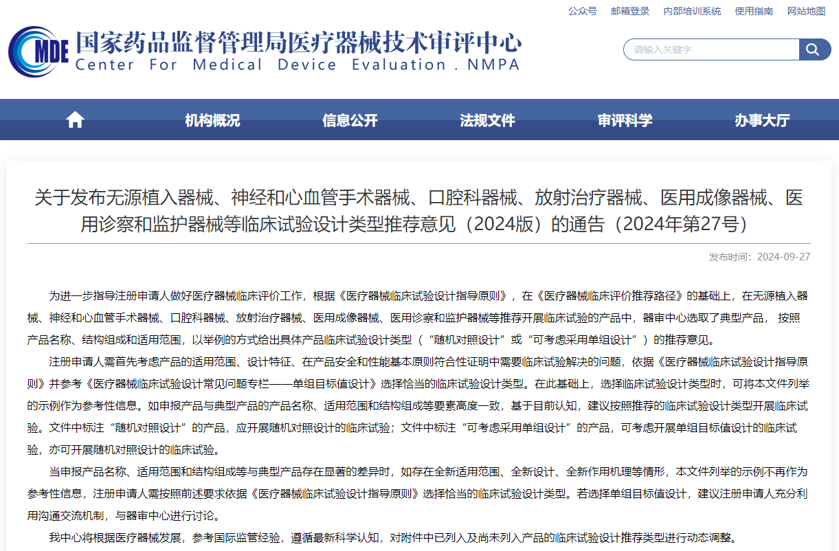 無源植入器械、神經(jīng)和心血管手術(shù)器械、口腔科器械、放射治療器械、醫(yī)用成像器械、醫(yī)用診察和監(jiān)護(hù)器械等臨床試驗(yàn)設(shè)計(jì)類型推薦意見近日,器審中心發(fā)布《無源植入器械、神經(jīng)和心血管手術(shù)器械、口腔科器械、放射治療器械、醫(yī)用成像器械、醫(yī)用診察和監(jiān)護(hù)器械等臨床試驗(yàn)設(shè)計(jì)類型推薦意見(2024版)的通告》。